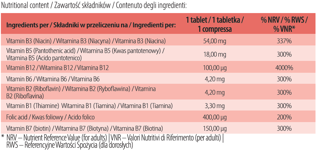 Състав: пълнител (микрокристална целулоза), ниацин (никотинамид), пантотенова киселина (калциева сол на D-пантотенат), витамин B12 (метилкобаламин), витамин B6 (пиридоксал-5-фосфат), рибофлавин (рибофлавин), тиамин (тиамин мононитрат), антислепващ агент (магнезиеви соли на мастни киселини), фолиева киселина (калциева сол на L-метилфолат), антислепващ агент (силициев диоксид), биотин (D-биотин).